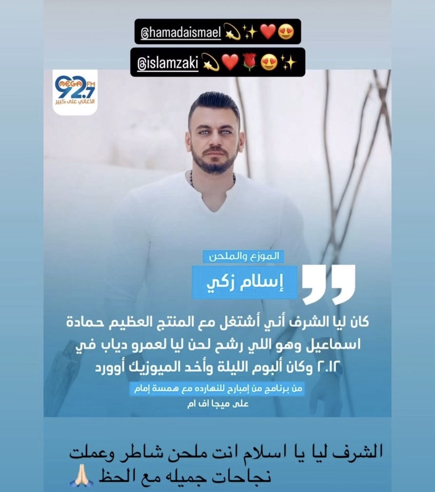 وعبر المنتج حماده إسماعيل عن تقديره لإسلام زكي عبر خاصية “الستوري” على حسابه بموقع إنستغرام، قائلاً: