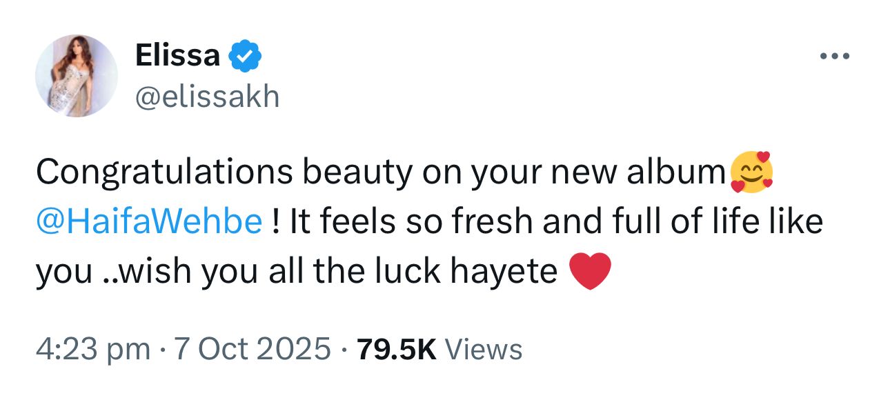 في التفاصيل، كتبت اليسا تدوينة عبر حسابها على اكس جاء فيها بما يعني باللغة العربية:”تهانيّ أيتها الجميلة على ألبومك الجديد! إنه منعش جداً ومليء بالحياة مثلك.. أتمنى لك كل الحظ حياتي”.