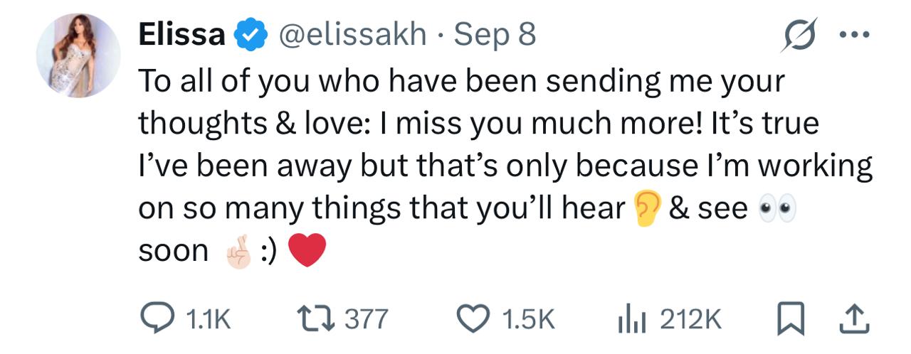 في هذا الاطار، كتبت إليسا تدوينة عبر حسابها على اكس جاء فيها بما يعني باللغة العربية:”إلى كل من أرسل لي أفكاره الإيجابية ومحبته، أشتاق إليكم أكثر”.تابعت:”صحيح أنني كنت غائبة لكن ذلك فقط بسبب أنني أعمل على الكثير من الأشياء ستسمعونها وترونها قريباً”.