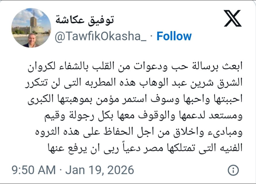 في خطوة أثارت ضجة على مواقع التواصل، نشر الإعلامي توفيق عكاشة عبر حسابه الرسمي على منصة X رسالة إلى النجمة شيرين عبد الوهاب، عبّر فيها عن دعمه الكامل لها خلال الأزمة الصحية التي تمر بها. الرسالة حملت مزيجًا من الدعاء والاهتمام، مع عرض استضافتها لمدة 45 يومًا مع توفير كل سبل الرعاية، ما لاقى استحسان جمهورها وتفاعلًا واسعًا على منصات التواصل الاجتماعي.جاءت رسالة توفيق عكاشة لتؤكد اعتزازه بموهبة شيرين عبد الوهاب، واصفًا إياها بـ”كروان الشرق” وموهبة فنية فريدة لا تتكرر.