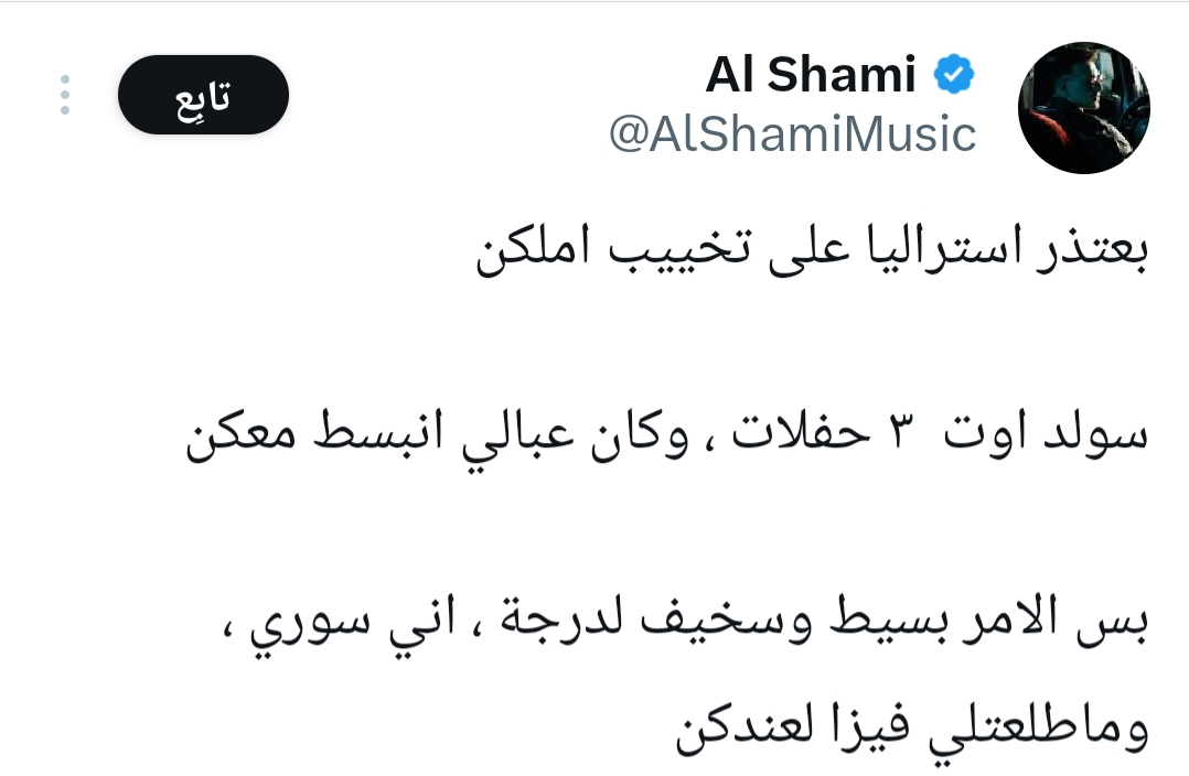 أعلن النجم الشامي عبر حسابه الرسمي على منصة «X» عن إلغاء ثلاث حفلات كان من المقرر أن يقدّمها في أستراليا، موضحاً أن السبب يعود إلى رفض منحه تأشيرة السفر كونه يحمل الجنسية السورية. هذا الإعلان جاء بصيغة مباشرة وصريحة، ليؤكد حرصه على أن تصل المعلومة إلى جمهوره من المصدر الرسمي، بعيداً عن أي اجتهادات أو نقل غير دقيق. في رسالته، عبّر النجم الشامي عن أسفه لتخييب آمال الجمهور الذي كان ينتظر لقاءه، مشيراً إلى أن الحفلات كانت قد بيعت بالكامل، وأنه كان يتطلع إلى مشاركة لحظات مميزة مع محبيه في أستراليا. وأضاف أن الأمر “بسيط وسخيف إلى درجة أني سوري، وما طلعتلي فيزا لعندكن”، في إشارة إلى العقبات الإدارية التي حالت دون سفره، مؤكداً أن التعويض سيكون في مناسبات أخرى. الحفلات الثلاث التي كان من المفترض أن تُقام في مدن أسترالية مختلفة كانت قد شهدت إقبالاً كبيراً، حيث أعلن المنظمون أنها “سولد أوت” قبل موعدها بفترة، ما يعكس حجم الشعبية التي يتمتع بها الشامي بين الجاليات العربية هناك. ومع ذلك، فإن الظروف الرسمية المرتبطة بالسفر حالت دون إتمام هذه الجولة الفنية، ليضطر الفنان إلى الاعتذار من جمهوره بشكل مباشر وشفاف. ردود الفعل على ما نشره الشامي عبر «X» جاءت واسعة عبر التعليقات والمشاركات، إذ عبّر كثيرون عن تفهّمهم للظروف، ورأوا أن الإعلان المباشر يضيف مصداقية أكبر إلى الخبر. كما أشار بعض المتابعين إلى أن هذه الطريقة تجعل الفنان أقرب إلى جمهوره، وتمنحه القدرة على التحكم في صورته الإعلامية بشكل أفضل. وقد اعتبر آخرون أن الاعتذار العلني يعكس احتراماً كبيراً للجمهور، ويؤكد أن الفنان يضع محبيه في مقدمة أولوياته. وقد حرص الشامي على أن تكون لغته بسيطة ومباشرة، مرتبطة بالحدث نفسه، ما جعل الرسالة تلقى صدى واسعاً وتنتشر بسرعة عبر المنصة. ورغم أن إلغاء الحفلات شكّل خيبة أمل لدى الجمهور الذي كان ينتظر اللقاء، فإن إدارة الحدث بأسلوب هادئ ومنظم ساهمت في تقليل الأثر السلبي، وأبقت الباب مفتوحاً أمام حلول عملية في المستقبل. وبين وضوح الرسالة وتفاعل الجمهور، يظهر أن الشامي أراد أن يضع الصدق والشفافية في مقدمة العلاقة مع محبيه ويرسّخ صورة فنان يتعامل مع وقائع العمل الفني بمسؤولية، ويضع التواصل المباشر في مقدمة أولوياته. ورغم أن إلغاء الحفلات أحزن الجمهور، إلا أن الرسالة التي وجّهها حملت قيمة إنسانية وفنية، وأكدت أن العلاقة بين الشامي وجمهوره تقوم على الصدق والشفافية، حتى في أصعب الظروف.