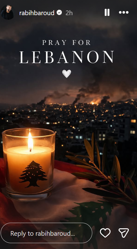 كما نشر النجم ربيع بارود صورة عبر الخاصية القصصية على حسابه الرسمي على” إنستغرام ” وأرفقها برسالة” صلوا للبنان “