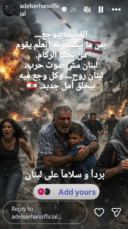من جهته، حرص المخرج عادل سرحان على التضامن مع لبنان حيث نشر صورة على الخاصية القصصية على حسابه الرسمي على” إنستغرام ” وأرفقها برسالة جاء فيها: “القصف بيوجع…