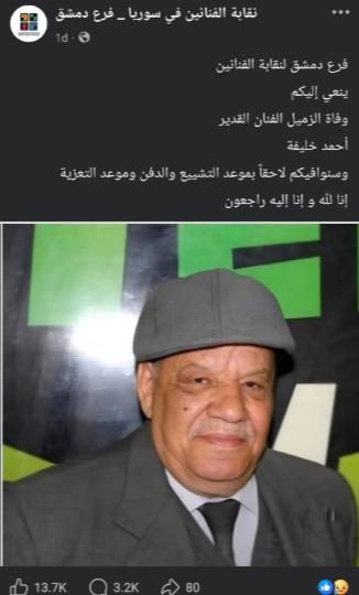 من جهتها، أعلنت نقابة الفنانين السوريين، فرع دمشق، نبأ الوفاة عبر صفحتها الرسمية على فيسبوك، ناعية الفنان الراحل بكلمات مقتضبة جاء فيها “ننعى إليكم وفاة الزميل الفنان القدير أحمد خليفة”.