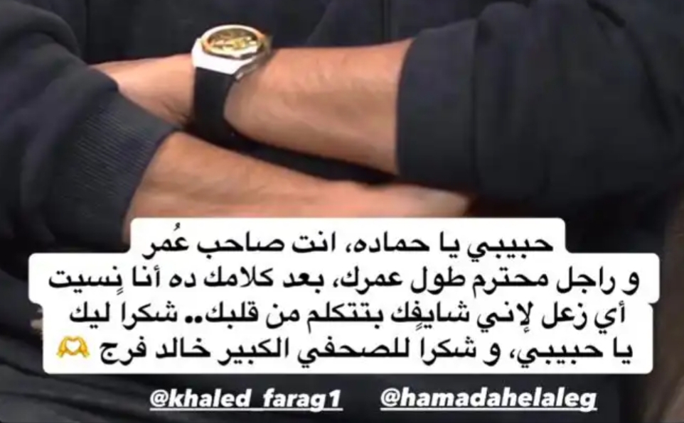 وجه النجم المصري تامر حسني رسالة صادقة للفنان حمادة هلال، بعد اعتذار الأخير له خلال حواره مع الإعلامي خالد فرج في برنامج Mirror، وذلك عقب الجدل الذي أُثير سابقًا حول أغنية “عيش بشوقك”.شارك تامر حسني عبر خاصية ستوري على منصة “إنستغرام” صورة مرفقة برسالة موجهة إلى حمادة هلال، أشاد فيها بزميله، مؤكدًا انتهاء أي خلاف بينهما، قائلاً:”حبيبي يا حماده، أنت صاحب عمر وراجل محترم طول عمرك، بعد كلامك ده أنا نسيت أي زعل لأني شايفك بتتكلم من قلبك.. شكرًا ليك يا حبيبي وشكرًا للصحفي الكبير خالد فرج.”أما الفنان حمادة هلال، فقد اعتذر لتامر حسني على خلفية الخلاف السابق، مؤكدًا أن علاقتهما تتجاوز أي خلافات، وقال:”تامر أخويا، وعمري ما هنسى وقفته معايا في فرحي. ما حدث لم يكن سوى انفعال لحظي، وأعبر عن أسفي لأي كلمة قد تكون سببت استيائه. مسألة الأغنية لم تسبب أي ضغينة، معتبرًا الأمر أرزاقًا، هي رزقه مش رزقي.”هذا التبادل يعكس الروح الإيجابية التي يتحلى بها الفنانان، حيث أظهرا احترامهما المتبادل وقدرتهما على تجاوز أي سوء تفاهم، مؤكدين أن العلاقات الشخصية والفنية يمكن أن تبقى قوية رغم أي اختلافات عابرة.الجمهور تفاعل بشكل واسع مع هذه الخطوة، معتبرًا أنها مثال على نضج الفنانين في التعامل مع الخلافات بعيدًا عن الشائعات، ومؤكدًا أن الاعتذار الصادق والحوار المباشر هما الطريقة الأمثل لحل أي سوء تفاهم.بهذا الموقف، أثبت تامر حسني وحمادة هلال أن الاحترام والتقدير المتبادل بين الفنانين يعكس صورة إيجابية عن الوسط الفني، ويعزز الثقة بين الجمهور والفنانين على حد سواء، مؤكدين أن الفن يظل جسرًا للتواصل والتقارب مهما كانت الظروف.