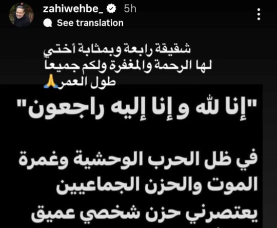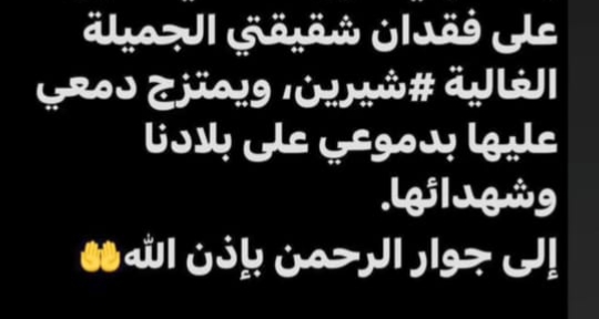 وأضافت في رسالتها أن دموعها على شيرين تمتزج بدموعها على الشهداء والوطن، في تعبير يعكس وحدة الألم في زمن تتكاثر فيه الخسارات.بالتوازي مع ذلك، شارك الشاعر والإعلامي زاهي وهبي، زوج رابعة الزيات، لحظة الحداد بطريقته الخاصة، حيث نشر عبر خاصية “القصص” على حسابه في إنستغرام كلمات نعي مقتضبة عبّر فيها عن حزنه وتعاطفه مع زوجته وعائلتها، في موقف يعكس التضامن العائلي في مواجهة هذا الظرف المؤلم.وقد تفاعل عدد كبير من الإعلاميين والفنانين مع الخبر، مقدمين التعازي لرابعة الزيات وعائلتها عبر منصات التواصل الاجتماعي، ومعبّرين عن مواساتهم في هذه الخسارة.