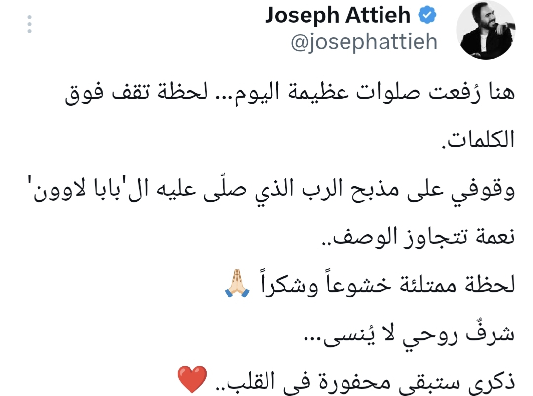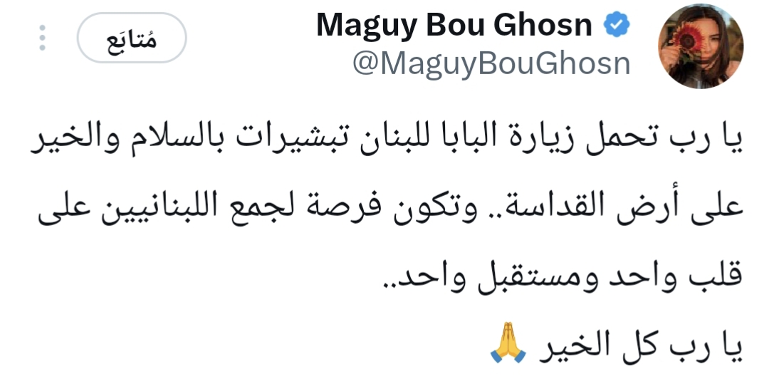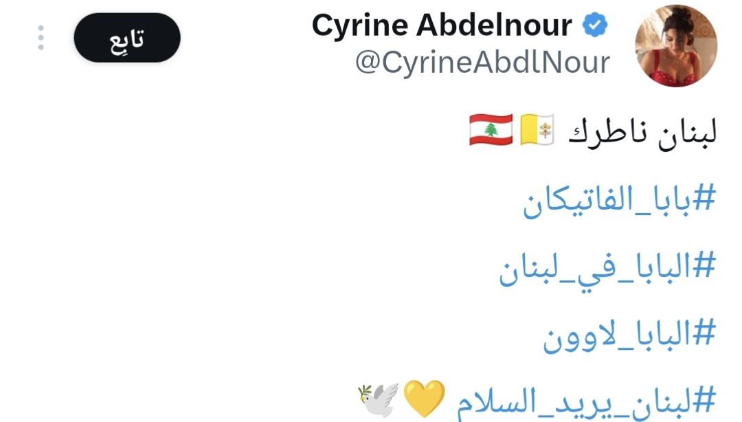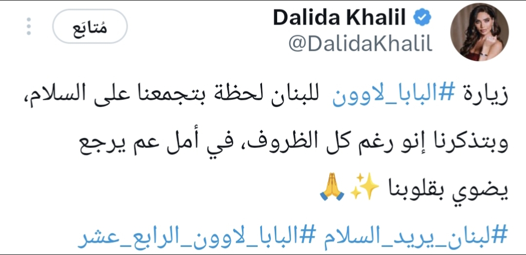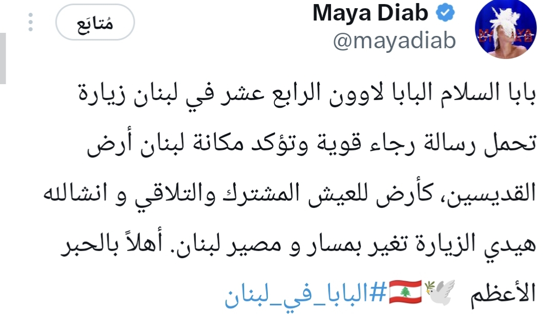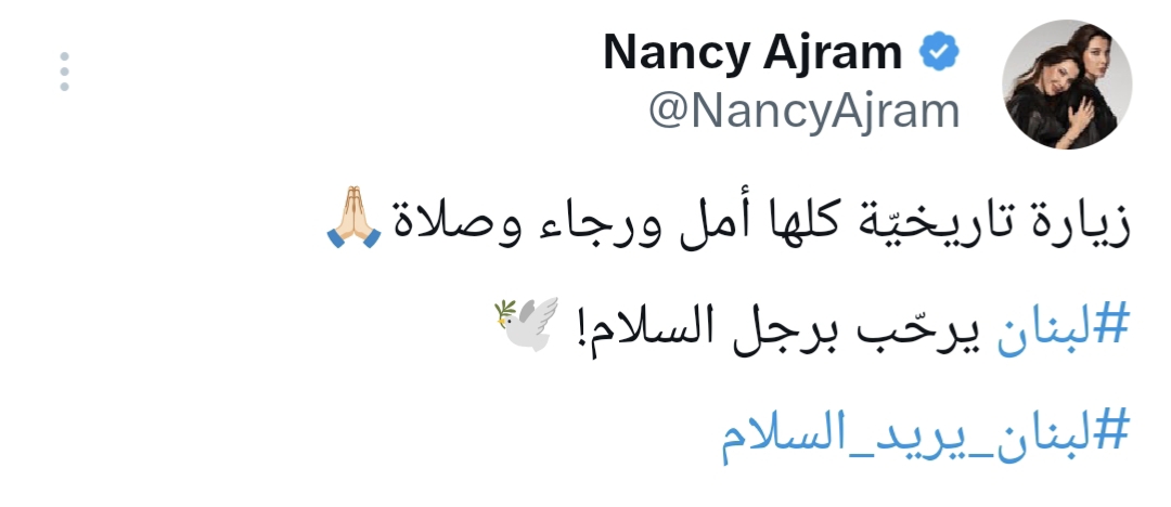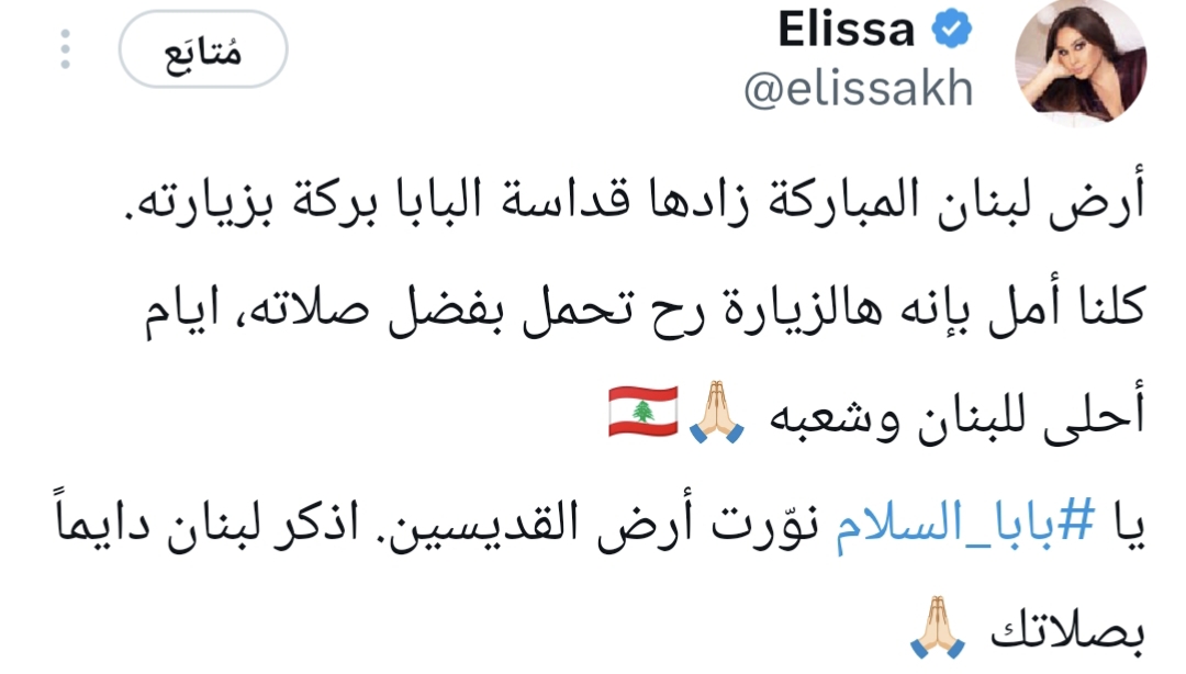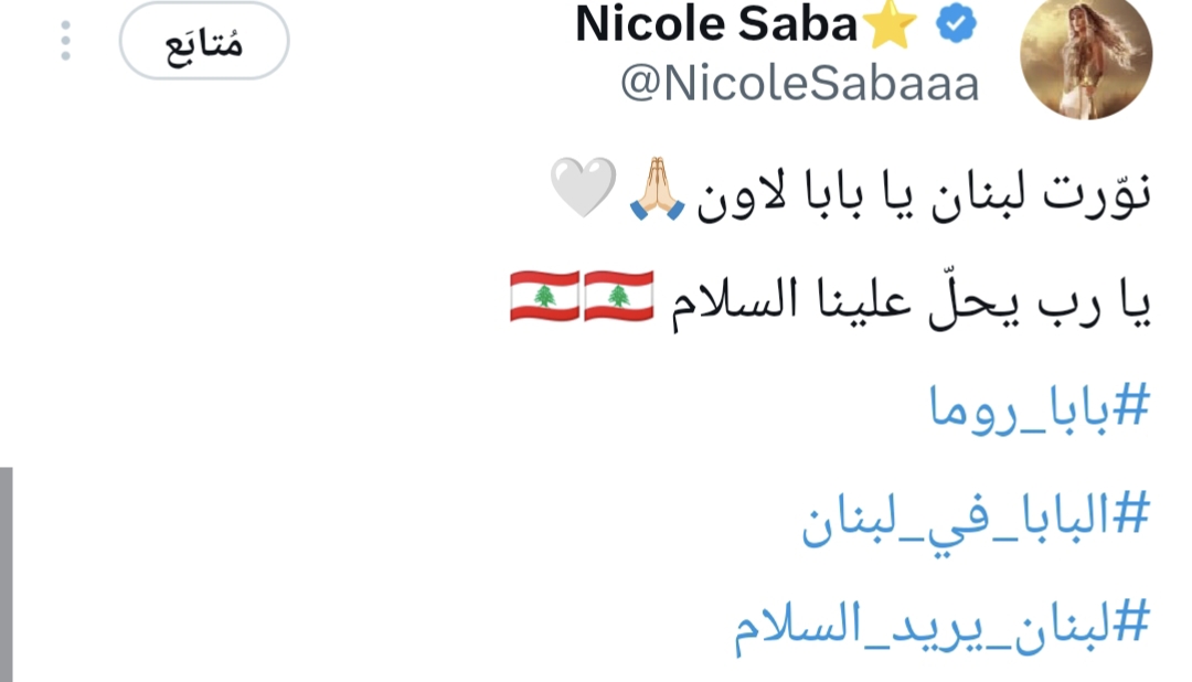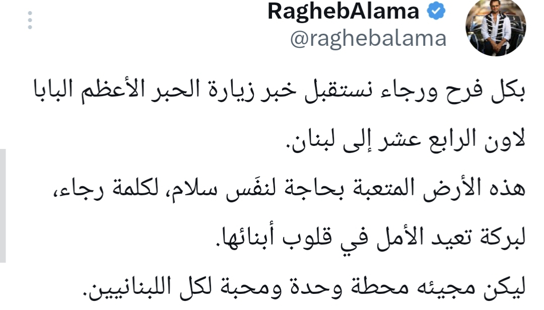 زيارة البابا لاوون الرابع عشر إلى لبنان لم تمر مروراً عادياً، بل تحوّلت إلى حدث وطني جامع، امتزج فيه البعد الديني بالفني ،السياسي والاجتماعي، ووجد صداه في الوسط الفني الذي عبّر عن مشاعره بصدق وحرارة. عبر الفنانون والممثلون عن فرحهم وأملهم بهذه الزيارة التاريخية، فكانت كلماتهم وتراتيلهم بمثابة صلاة جماعية على أرض لبنان المتعبة، الباحثة عن رجاء جديد. عبّرت ملكة الاحساس إليسا عن مشاعرها بقولها إن أرض لبنان المباركة زادها قداسة البابا بركة بزيارته، مؤكدة أن الأمل كبير بأن تحمل هذه الزيارة أياماً أجمل للبنان وشعبه، وختمت رسالتها بنداء إلى “بابا السلام” أن يذكر لبنان دائماً في صلاته. أما شمس الأغنية نجوى كرم فقد شاركت بكلمات مؤثرة، إذ دعت إلى دق أجراس الكنائس ورفع أصوات الأذان، معتبرة أن رتبة البابا عند الله لا يعلو عليها شيء، ثم أضافت أن وجوده في لبنان ليس دينياً فقط، بل هو إثبات أن لبنان رسالة، ومن له أذنان للسمع فليسمع. النجمة الذهبية نوال الزغبي رأت أن زيارة البابا على أرض موجوعة ما زالت تحلم بالسلام تحمل أملاً كبيراً، فيما عبّر السوبر ستار راغب علامة عن فرحه ورجائه بهذه الزيارة، مؤكداً أن لبنان المتعب بحاجة إلى نفس سلام وكلمة رجاء وبركة تعيد الأمل في قلوب أبنائه، وأن مجيء البابا يجب أن يكون محطة وحدة ومحبة لكل اللبنانيين. ملك الرومانسية وائل كفوري اكتفى بآية من الإنجيل: “طوبى لصانعي السلام، لأنهم أبناء الله يدعون”، بينما كتبت النجمة نانسي عجرم أن الزيارة تاريخية مليئة بالأمل والرجاء والصلاة، مرحبة بـ “رجل السلام”. الفنانة مايا دياب وصفت الزيارة بأنها تحمل رسالة رجاء قوية وتؤكد مكانة لبنان أرض القديسين، أرض العيش المشترك والتلاقي، متمنية أن تغيّر هذه الزيارة مسار ومصير لبنان. أما النجمة سيرين عبد النور فقد رحّبت بالبابا بقولها: “أهلا وسهلا نورتنا”، والنجمة نيكول سابا كتبت: “نوّرت لبنان يا بابا لاوون، يا رب يحلّ علينا السلام”. ولم يقتصر التفاعل على الكلمات، بل امتد إلى التراتيل المصوّرة. بينما عبّر الفنان ناجي الأسطا عن المناسبة بطريقته الخاصة، إذ وضع ترتيلة روحية بصوته، وأرفقها احتفالاً بقدوم قداسة البابا لاوون الرابع عشر إلى لبنان، ليحوّلها إلى رسالة وجدانية تجمع بين الصوت والصورة في لحظة روحية ووطنية واحدة. الفنان جوزيف عطية فقد نشر فيديو لترتيلة روحية عبّر فيها عن لحظة خشوع على مذبح الرب الذي صلّى عليه البابا، وكتب أن هذه النعمة تتجاوز الوصف، وأنها ذكرى ستبقى محفورة في القلب. أما الفنانة عبير نعمة قدّمت ترتيلة بصوتها احتفالاً بقدوم قداسة البابا لاوون الرابع عشر إلى لبنان، لتضيف بُعداً روحياً جديداً إلى المشهد، وتؤكد أن الفن في جوهره صلاة جماعية تعبّر عن وحدة اللبنانيين في استقبال هذه الزيارة التاريخية، الفنان جو أشقر بدوره قال إن زيارة البابا ليست عادية، بل هي تذكير بأن الخير والأمل ما زالا موجودين، وأن لبنان يبقى أرض السلام رغم كل شيء. أما الممثلون، فقد كان لهم أيضاً حضور بارز في هذه اللحظة. النجمة ماغي بو غصن كتبت أن زيارة البابا يجب أن تحمل تبشيرات بالسلام والخير على أرض القداسة، وأن تكون فرصة لجمع اللبنانيين على قلب واحد ومستقبل واحد. النجمة ورد الخال عبّرت بقولها: “زيارتك بركة، يا مية أهلا وسهلا، في أحلى من هيك؟ يا رب”، فيما كتبت الممثلة داليدا خليل أن زيارة البابا للبنان لحظة تجمع اللبنانيين على السلام، وتذكّرهم أن الأمل ما زال يضيء القلوب رغم الظروف. بهذا التفاعل، تحوّلت زيارة البابا لاوون الرابع عشر إلى حدث جامع، حيث التقت السياسة بالدين والفن في مساحة واحدة. كلمات الفنانين وتراتيلهم، ورسائل الممثلين، شكّلت لوحة وجدانية عبّرت عن وحدة اللبنانيين في لحظة تاريخية، وأكدت أن الفن ليس بعيداً عن السياسة، بل هو جزء من التعبير الوطني والروحي في آن واحد. زيارة البابا لم تكن مجرد محطة بروتوكولية، بل لحظة أمل وصلاة، كتبتها أصوات الفن 