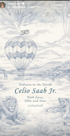 أعلنت زين قطامي، زوجة سيليو صعب نجل المصمم اللبناني العالمي إيلي صعب، إستقبالها طفلهما الأول بعد حوالي عام على زواجهما.