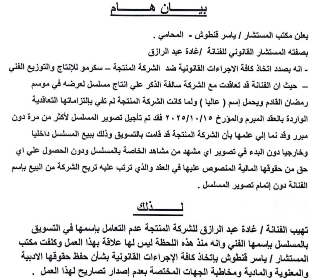 غادة عبد الرازق وياسر قنطوش في مواجهة قانونية مع منتج مسلسل «عاليا» قبل موسم رمضان 2026