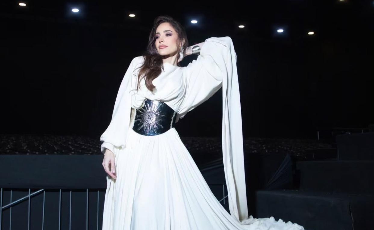 وظهرت كارمن بصيبص في الصورة وهي تقف وترتدي فستانًا أسود طويلًا، وقد وضعت يديها على بطنها.