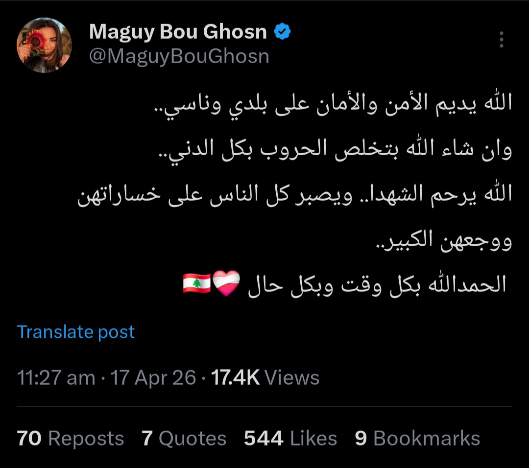 ختمت ماغي بو غصن تدوينتها بعبارة “الحمد لله بكل وقت وبكل حال”، مرفقة إياها بالعلم اللبناني وقلب تعبيراً عن حبها لبلدها.