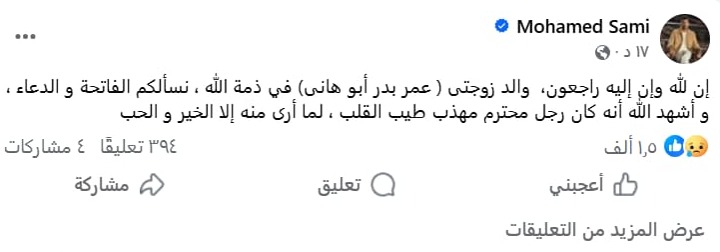 وكتب محمد سامي: “إنا لله وإنا إليه راجعون.. والد زوجتي عمر بدر أبو هاني في ذمة الله، نسألكم الفاتحة والدعاء”، مشيدًا بأخلاق الراحل وسيرته الطيبة، حيث أضاف: “وأشهد أنه كان رجل محترم مهذب طيب القلب، لم أرَ منه إلا الخير والحب”.