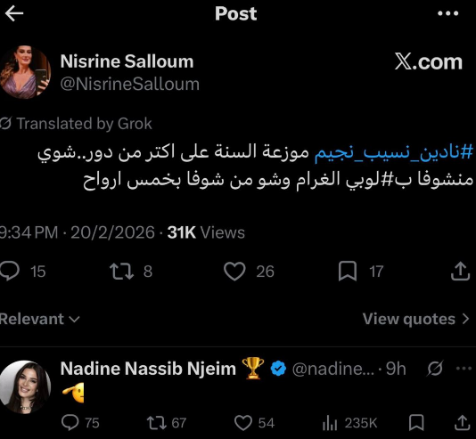 بدورها، ردّت نادين نسيب نجيم على التدوينة عبر “إيموجي التحية”، وهو ما اعتبره البعض موافقة ضمنية، فيما رأى آخرون أنه مجرد تفاعل عفوي، الأمر الذي أشعل النقاش بين جمهور النجمات الثلاث.