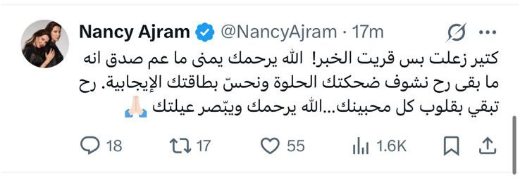 بدورها ، كتبت الفنانة اللبنانية سيرين عبد النور تدوينة جاء فيها:”يمنى الله معك يا اجمل قلب ونفسية كتير صادم ومحزن خبر وفاتك بس اكيد انتي بمكان مليان سلام الله يرحمك”.