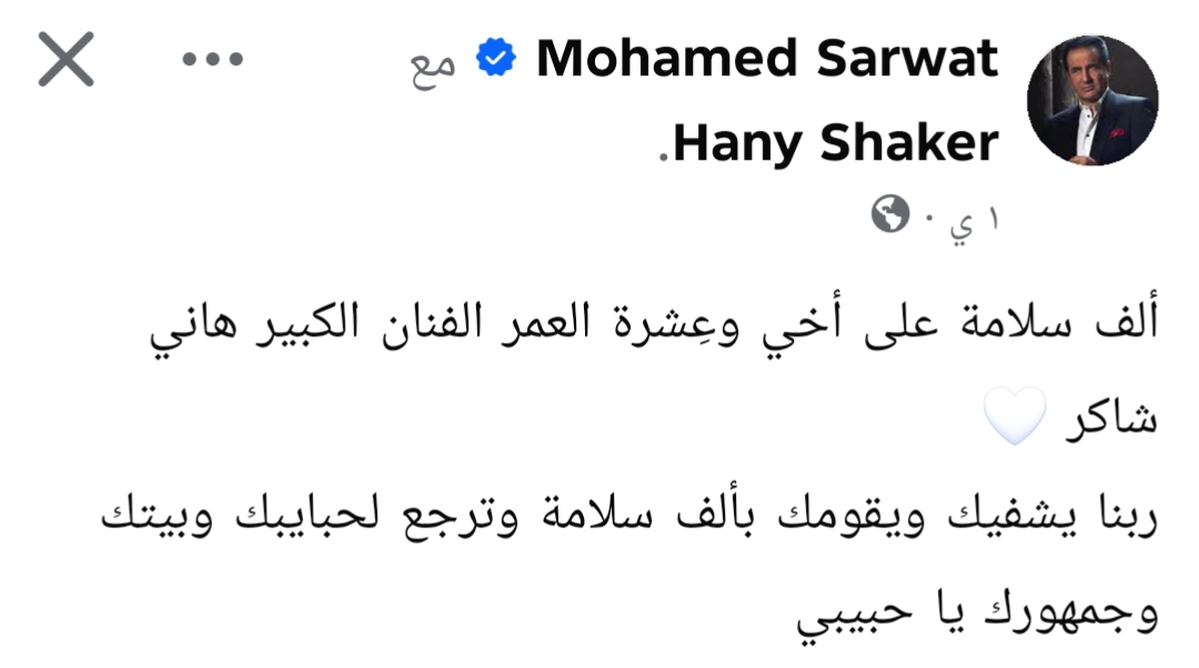 وأوضح نقيب الموسيقيين أن هاني شاكر يتمتع الآن بحالة صحية مستقرة، مع تحسن ملحوظ في وضعه العام، متمنياً له دوام العافية والعودة السريعة لجمهوره.وأضاف مصطفى كامل أن المكالمة حملت أيضاً ذكريات من سنوات طويلة من التعاون الفني بينه وبين هاني شاكر، حيث اتفقا على إطلاق أغنيتين جديدتين خلال الفترة المقبلة، في تعاون جديد بعد سلسلة من النجاحات التي جمعت بينهما سابقاً، ومنها أغاني بارزة مثل: “ياريتني”، “هنعيش”، “الحلم الجميل”، “سألتك إنتي مين”، “المفروض”، “سبتيني ليه”، “أنا عيني لحبيبي”، و”أتكلم قول للعالم”.
