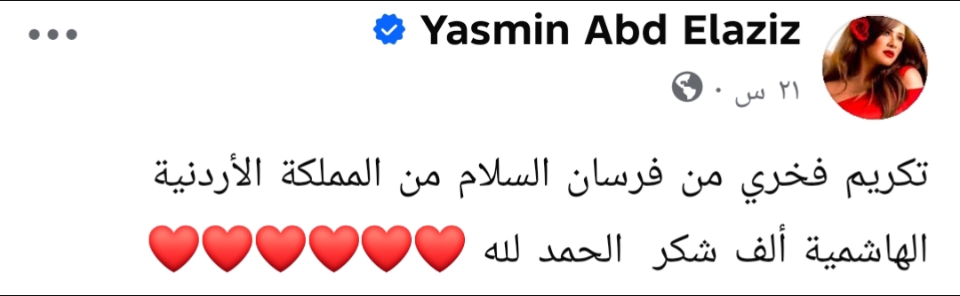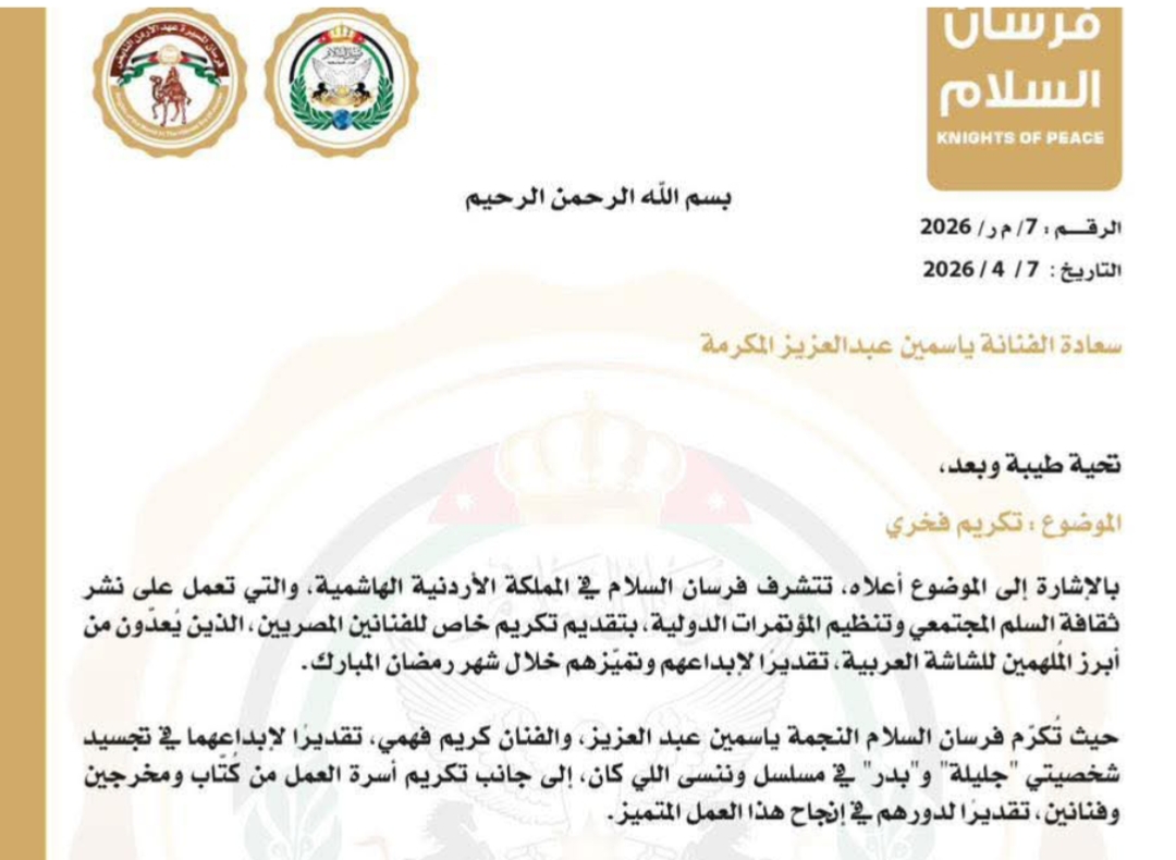 ياسمين عبد العزيز تتألق بتكريم فرسان السلام في الأردن